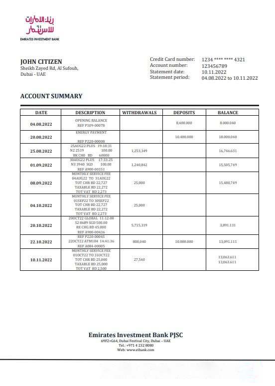 United Arab Emirates Investment Bank statement template in Word and PDF format download template file