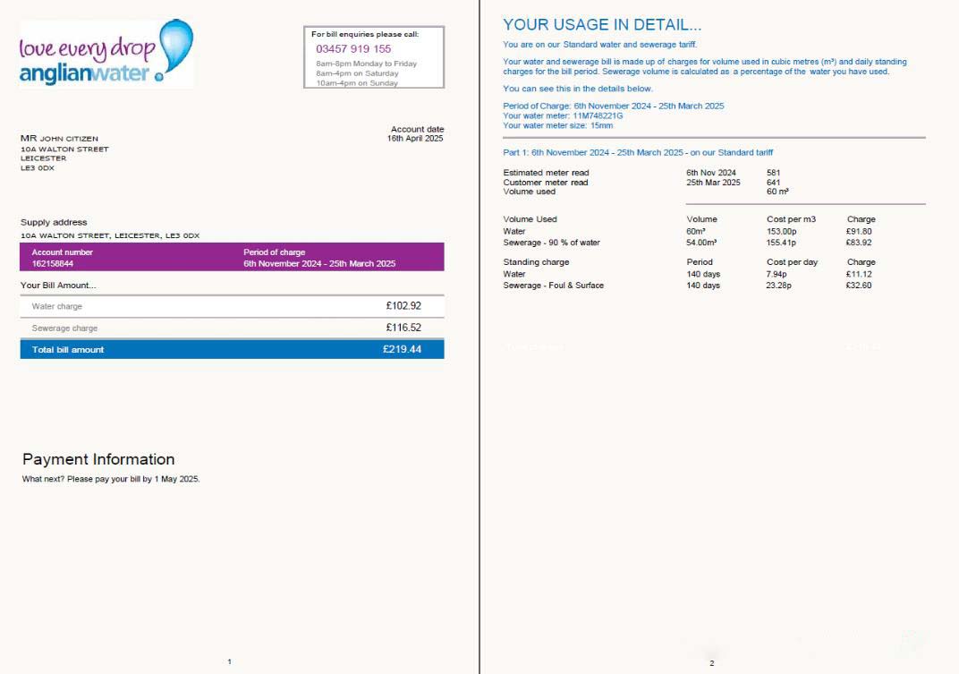 United Kingdom Anglian Water utility bill template in Word and PDF formats, 2 pages download template file