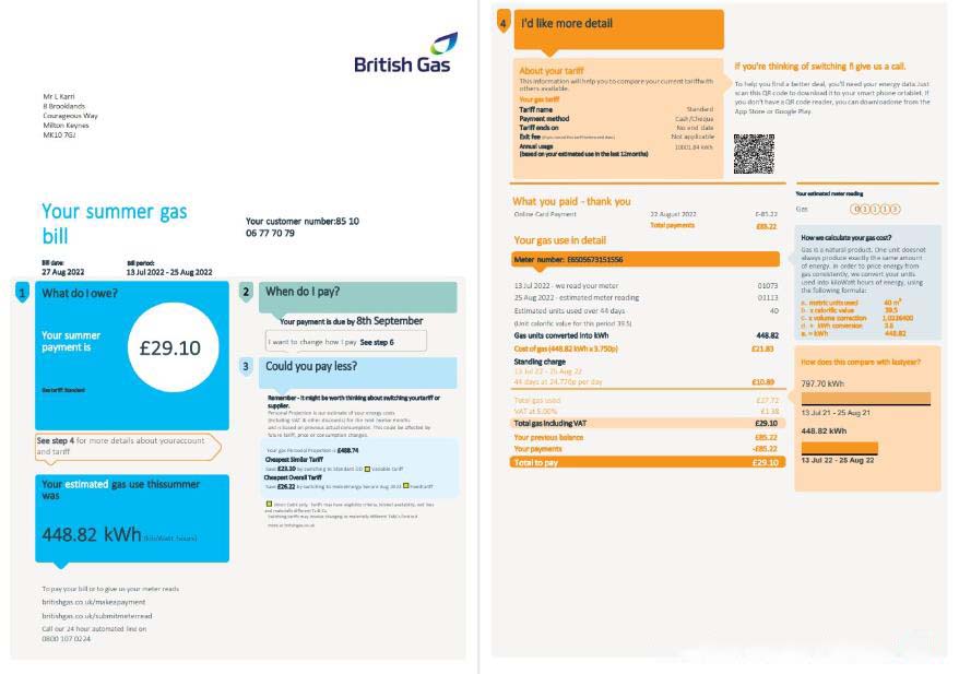 United Kingdom British Gas utility bill, Word and PDF template, 4 pages 1 2 download template file
