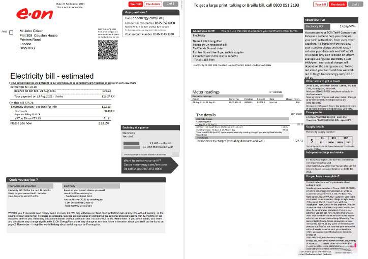 United Kingdom E.ON electricity utility bill template in Word and PDF format, 2 pages, version 1 download template file