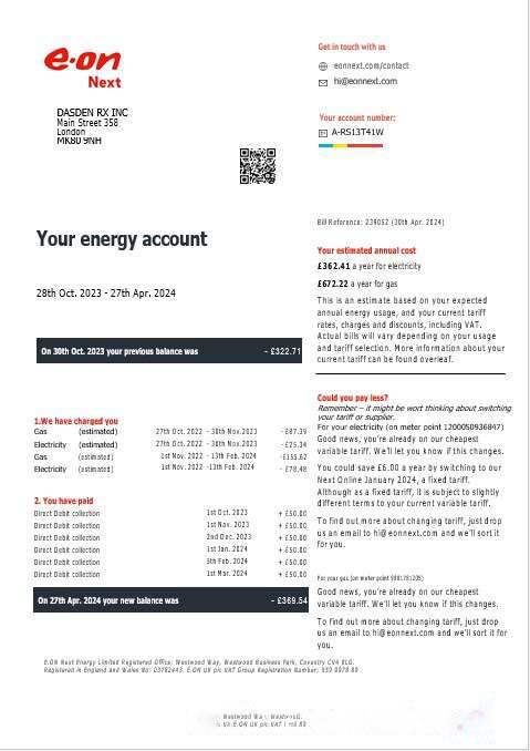 United Kingdom Eon gas and electricity business utility bill in Word and PDF formats, version 7 download template file