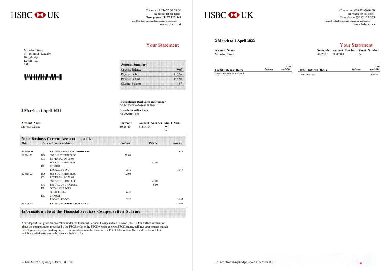 United Kingdom HSBC bank business account statement Word and PDF template, 3 pages download template file
