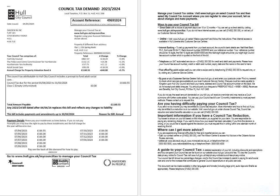 United Kingdom Hull City Council business utility bill template in Word and PDF formats, 2 pages download template file