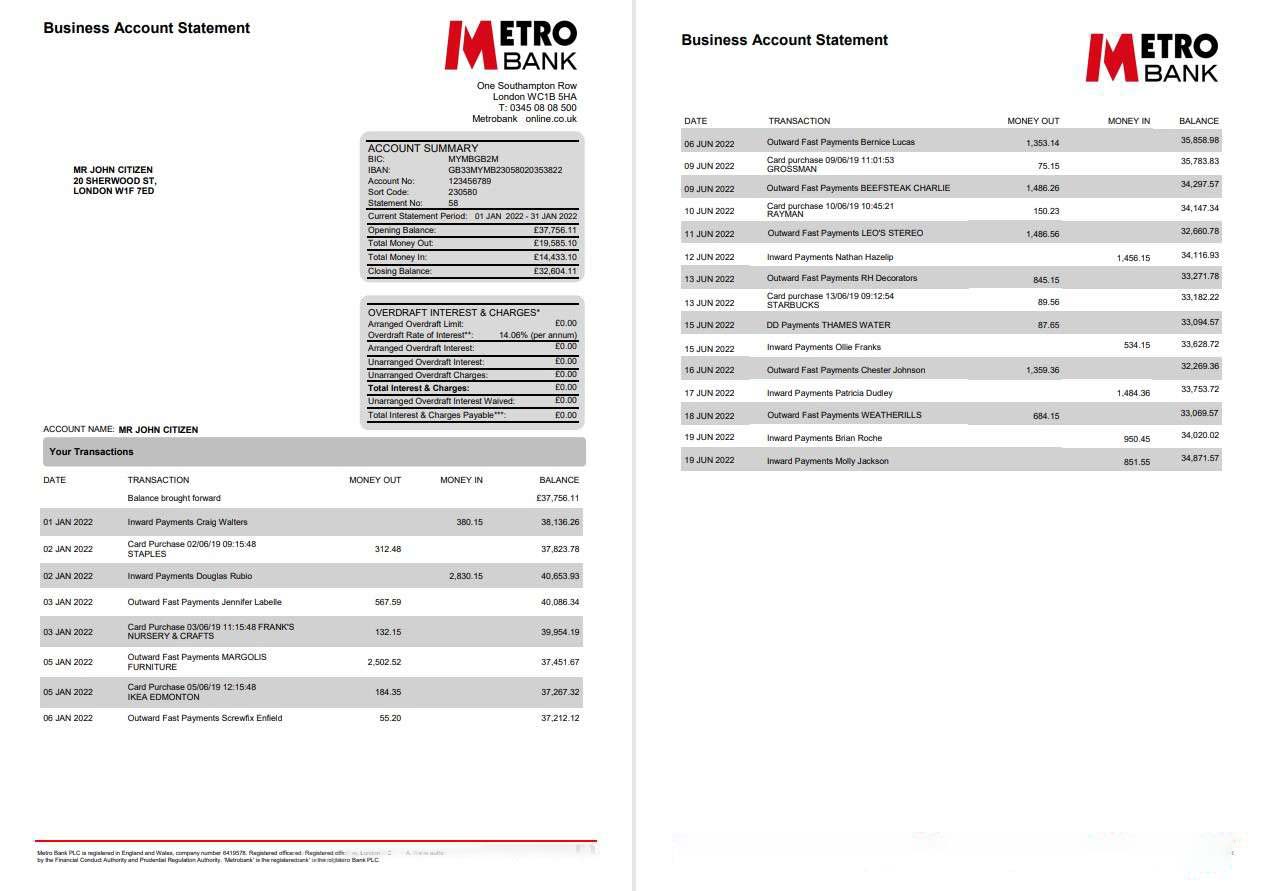 United Kingdom Metro bank business account statement Word and PDF template, 4 pages download template file