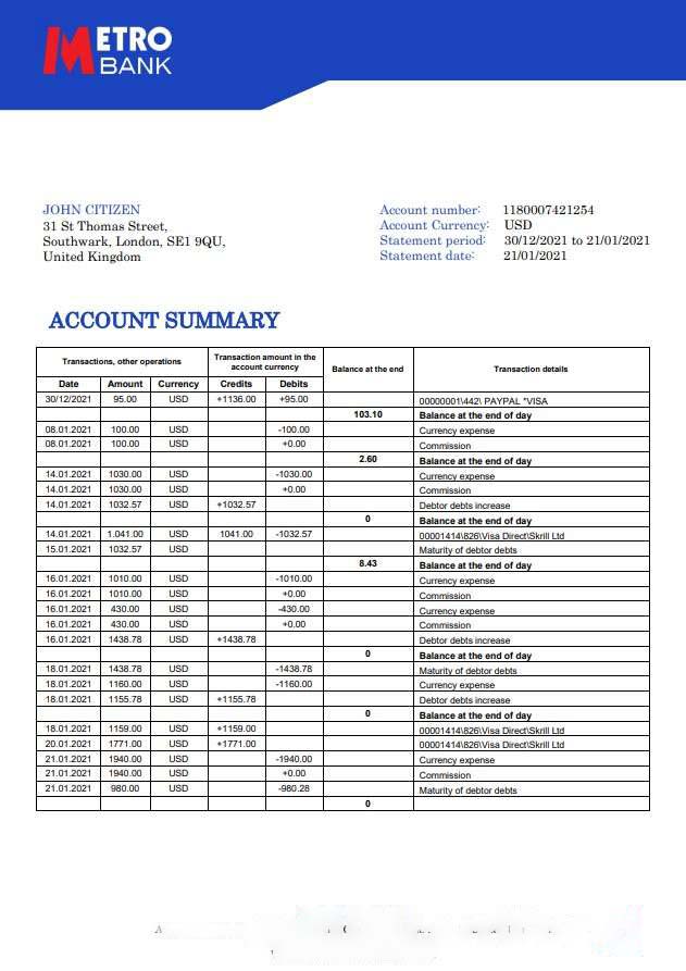 United Kingdom Metro Bank statement template in Word and PDF format download template file