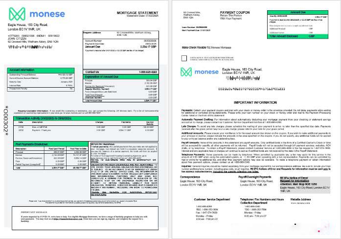United Kingdom Monese bank mortgage statement in Word and PDF formats 1 2 download template file