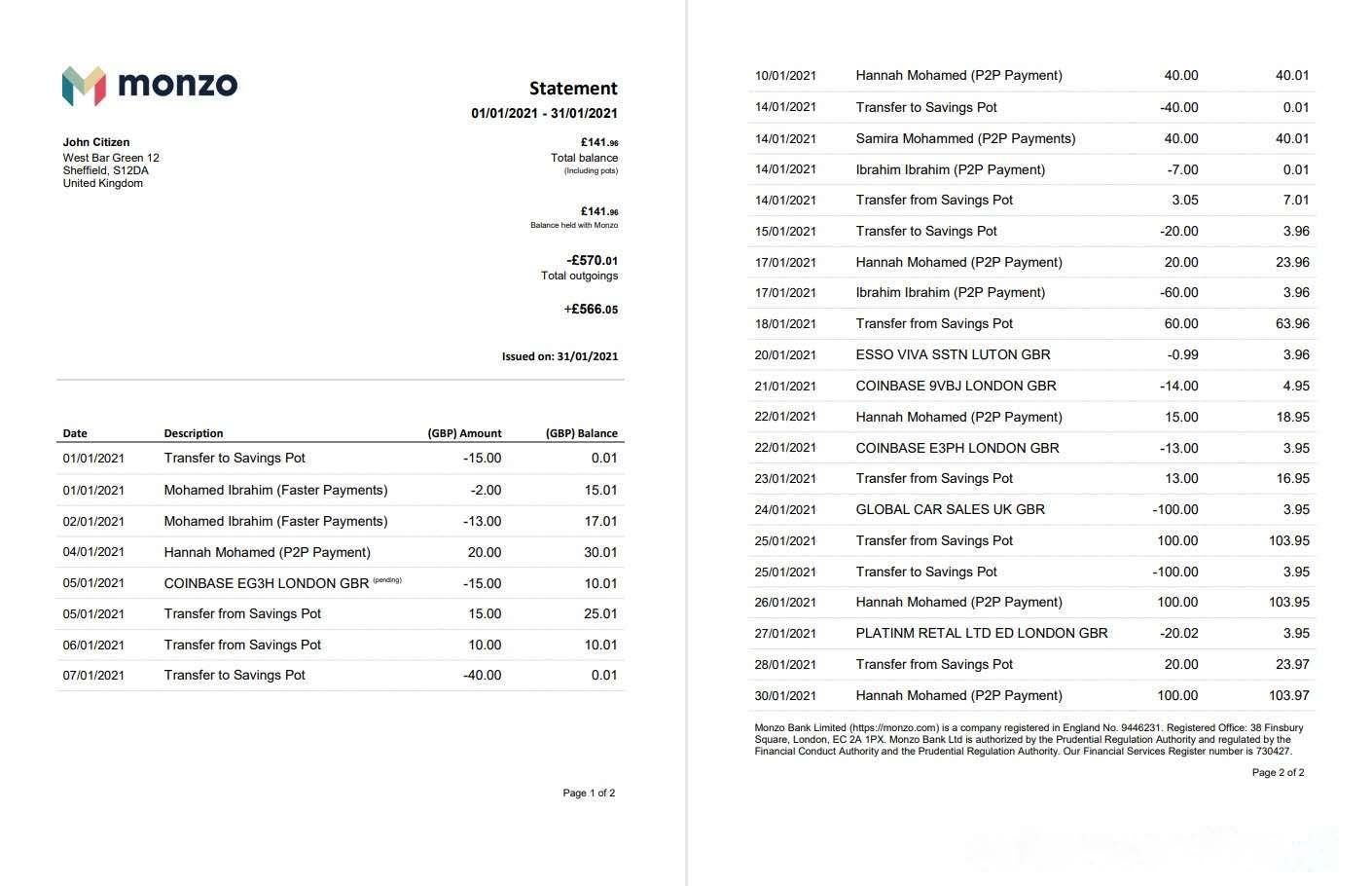 United Kingdom Monzo bank statement template in Word and PDF format (3 pages), good for address prove download template file