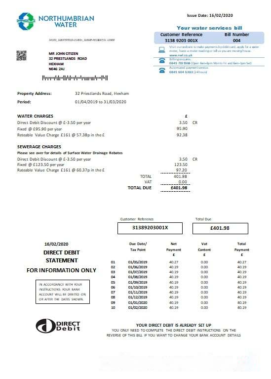 United Kingdom Northumbrian Water utility bill template in Word and PDF format, version 2 download template file