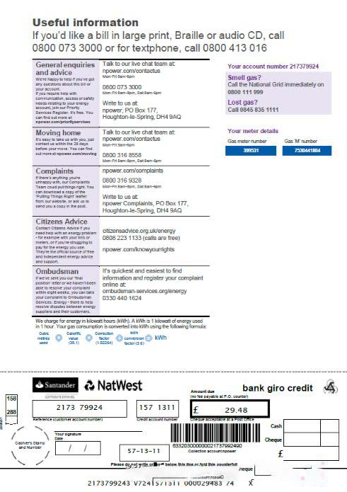 United Kingdom Npower utility bill template in Word and PDF formats, 3 pages, 3rd page download template file