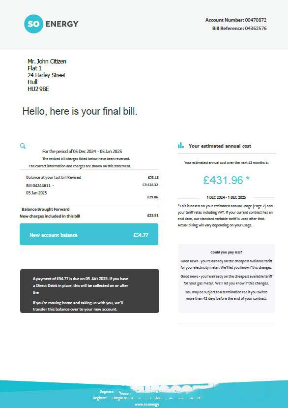 United Kingdom So Energy utility bill template in Word and PDF formats download template file