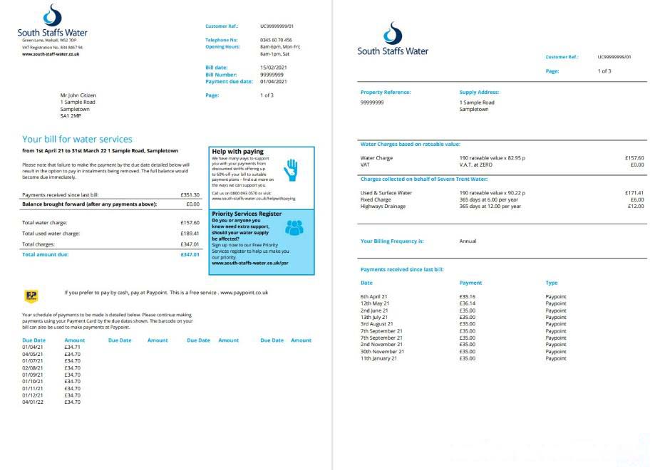 United Kingdom South Staffs Water utility bill template in Word and PDF format, 2 pages download template file