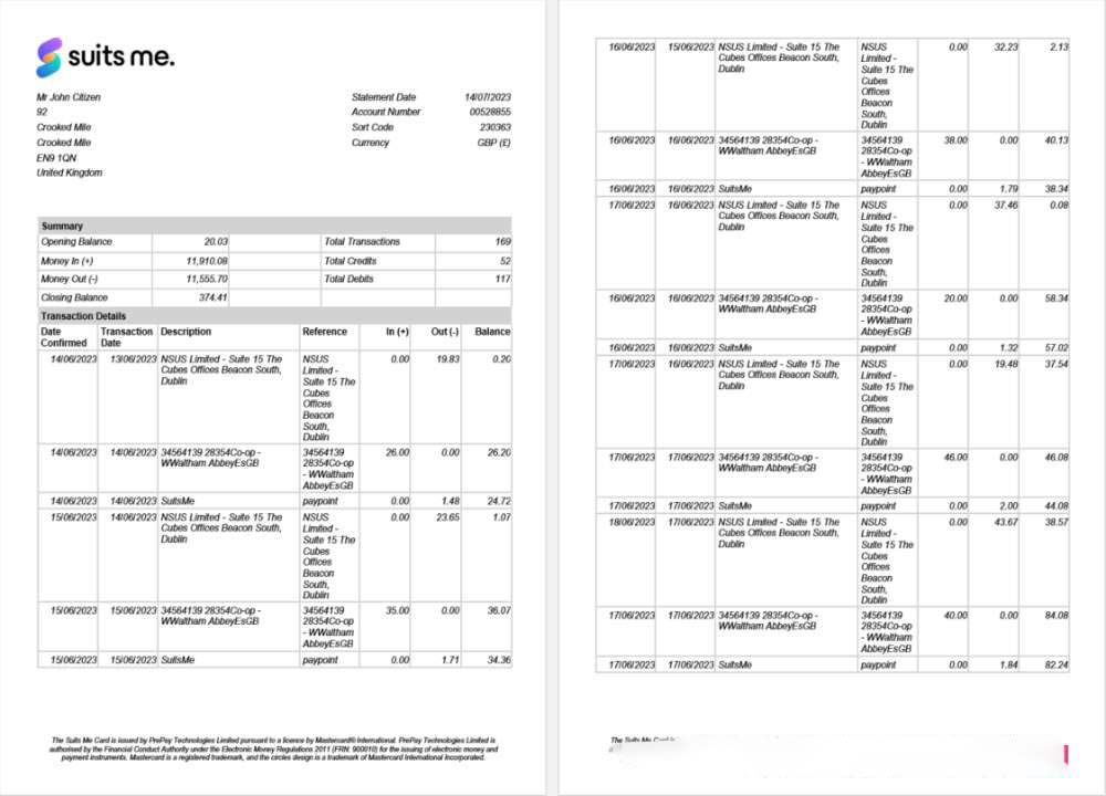 United Kingdom Suits Me bank statement Word and PDF template, 2 pages download template file