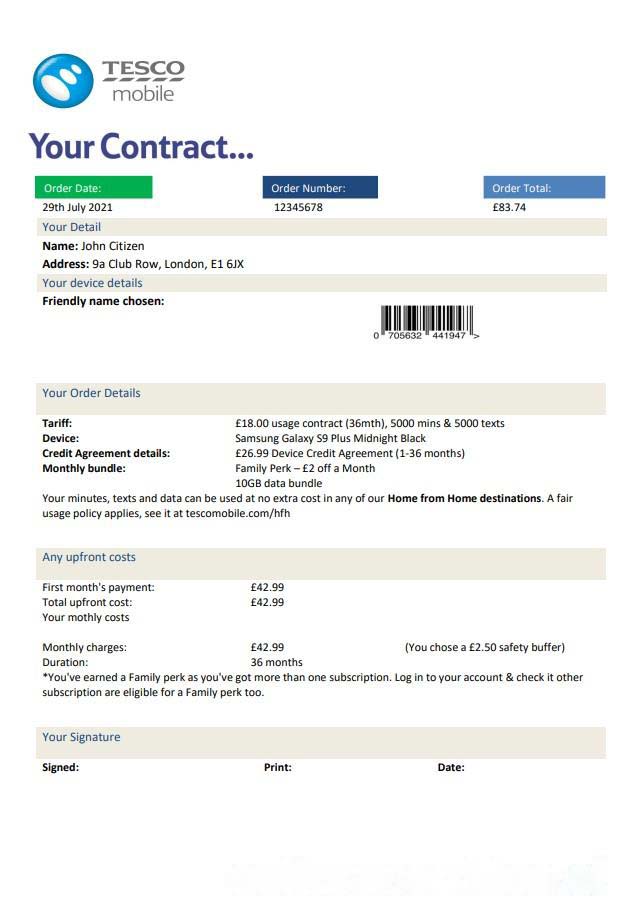 United Kingdom Tesco Mobile utility bill template in Word and PDF format download template file