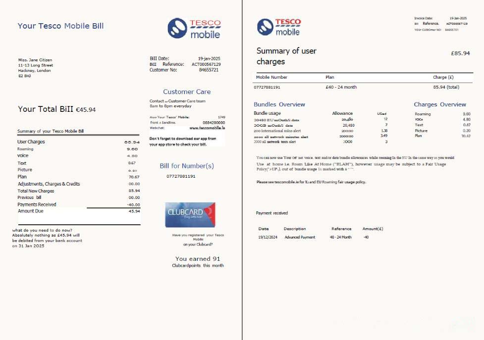 United Kingdom Tesco Mobile utility bill template in Word and PDF formats, 2 pages, version 2 download template file