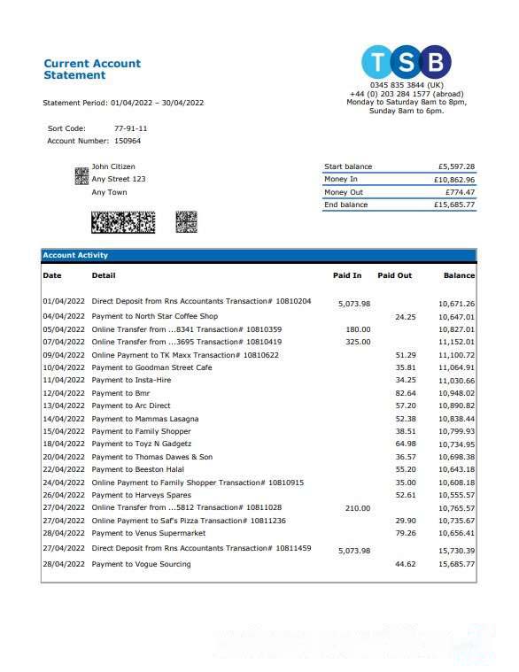 United Kingdom TSB bank statement, Excel and PDF template download template file