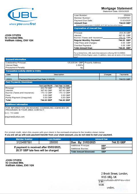 United Kingdom United Bank Ltd (UBL) bank mortgage statement in Word and PDF formats download template file