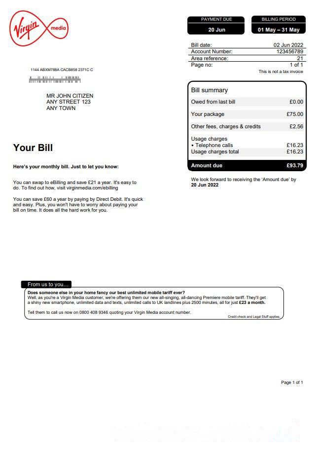 United Kingdom Virgin Media utility bill, Word and PDF template download template file