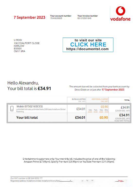 UNITED KINGDOM VODAFONE utility bill Word and PDF template download template file