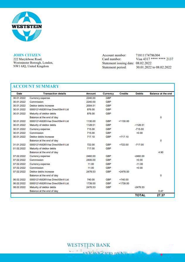 United Kingdom Weststein Bank Word download template file