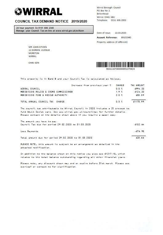 United Kingdom Wirral council tax bill template in Word and PDF format download template file