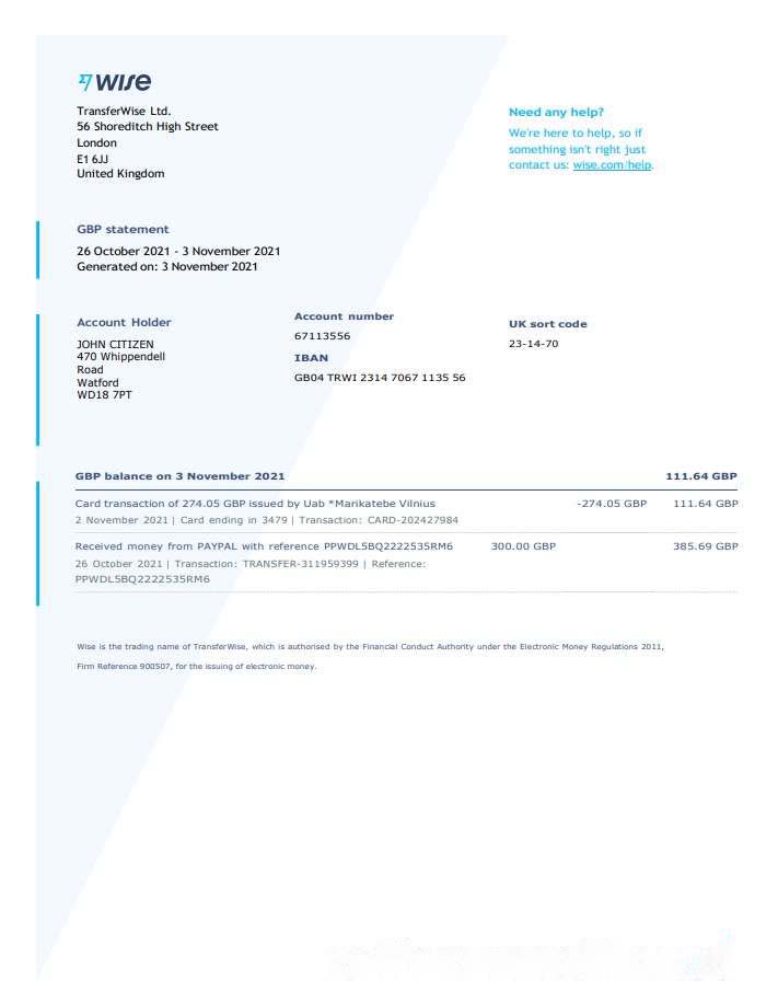 United Kingdom Wise bank statement template in Word and PDF format download template file