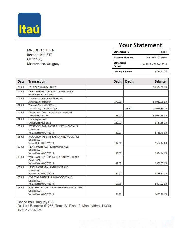 Uruguay Itau bank statement template in Word and PDF format download template file