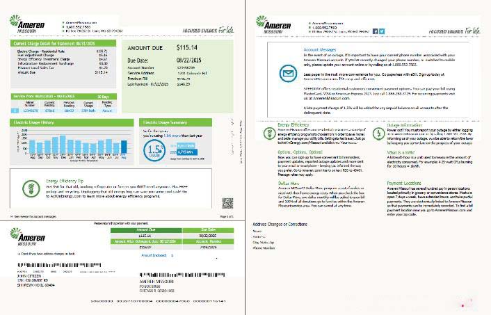 USA Ameren Missouri utility bill template in Word and PDF formats, 2 pages download template file