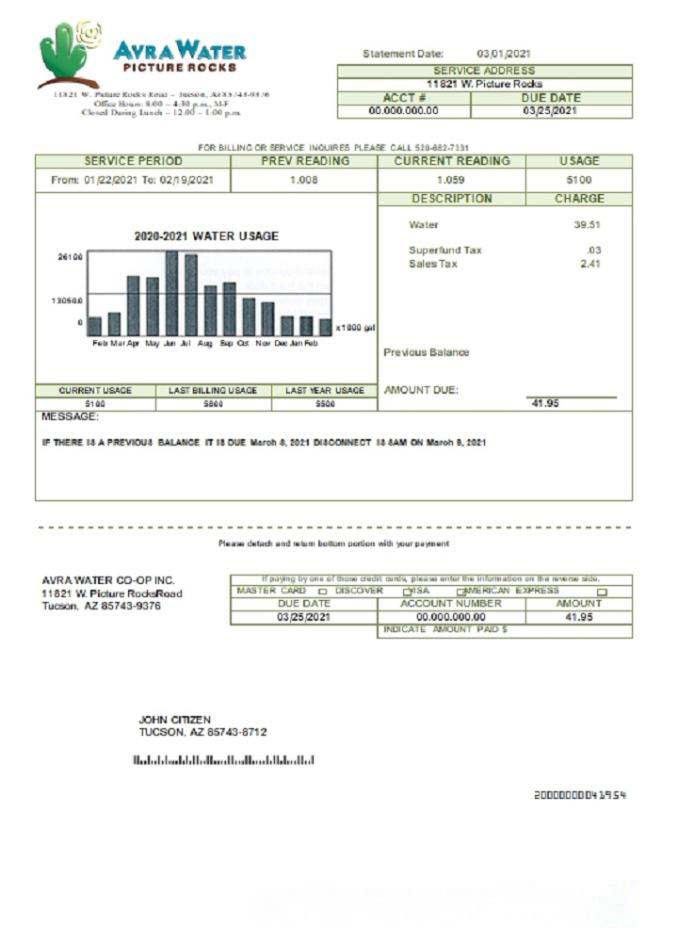 USA Arizona Avra Water utility bill template in Word and PDF format download template file
