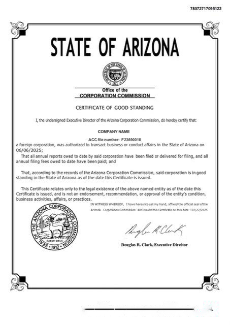 USA Arizona certificate of good standing Word and PDF template, version 2 download template file