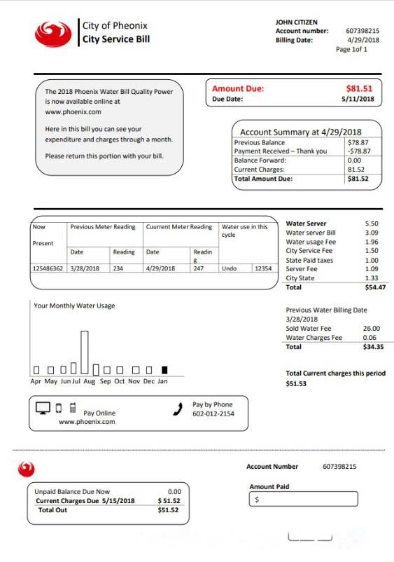 USA Arizona City of Phoenix utility bill template in Word and PDF format download template file