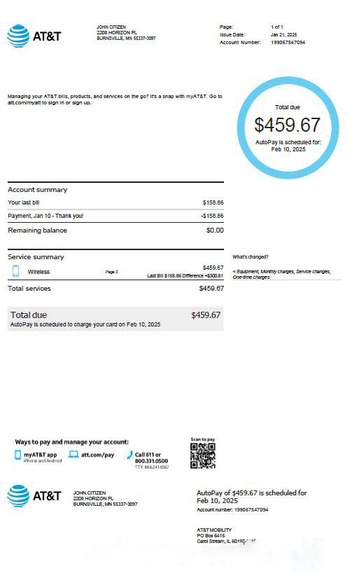 USA AT&T utility bill template in Word and PDF formats, version 3 download template file