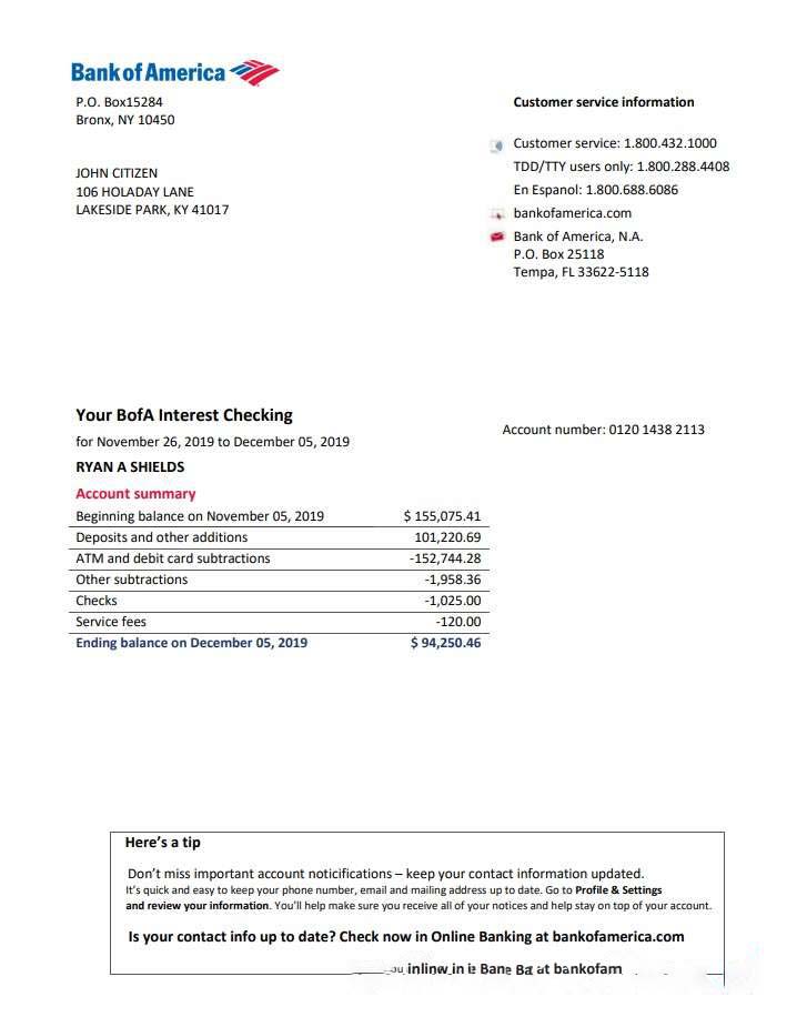 USA Bank of America bank statement easy to fill template in Word and PDF format download template file