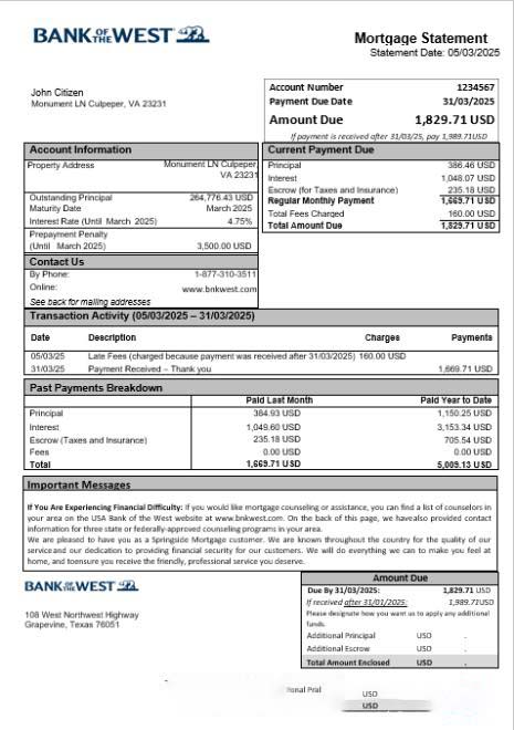 USA Bank of the West bank mortgage statement in Word and PDF formats download template file