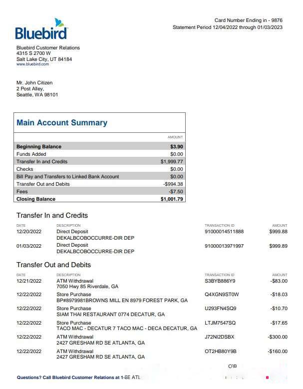 USA Bluebird bank statement Word and PDF template, 3 pages download template file