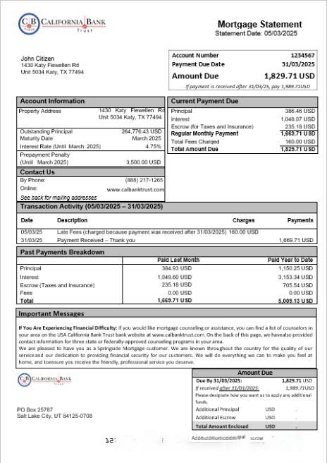 USA California Bank Trust bank mortgage statement in Word and PDF formats download template file