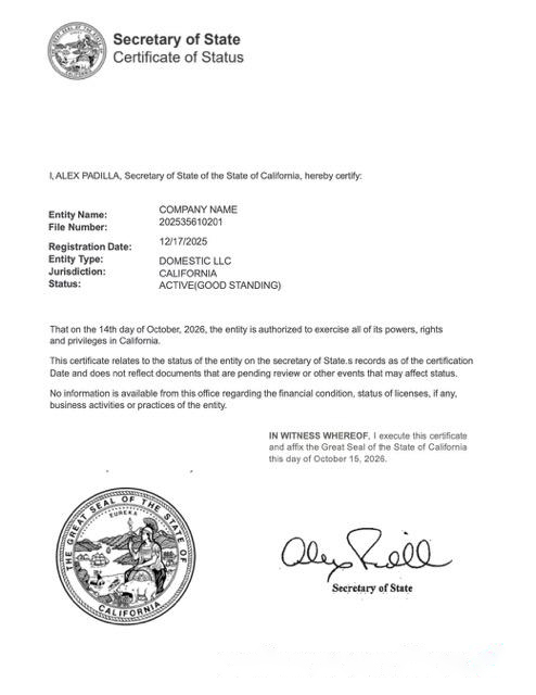 USA California certificate of good standing Word and PDF template, version 2 download template file