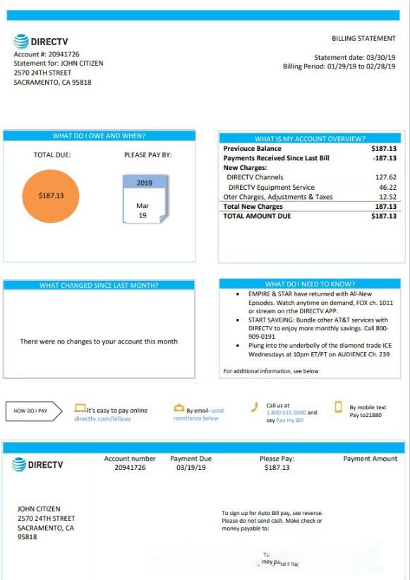 USA California Directv utility bill template in Word and PDF format, good for address prove download template file