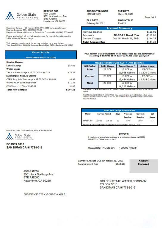 USA California Golden State Water Company utility bill template in .doc and .pdf format download template file