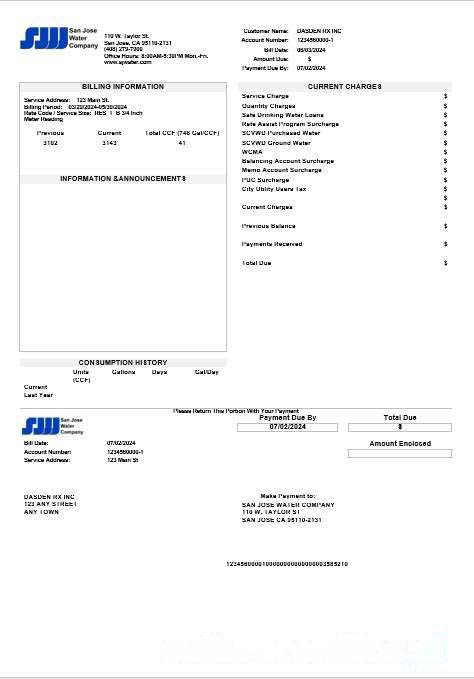 USA California San Jose Water business utility bill template in Word and PDF formats download template file