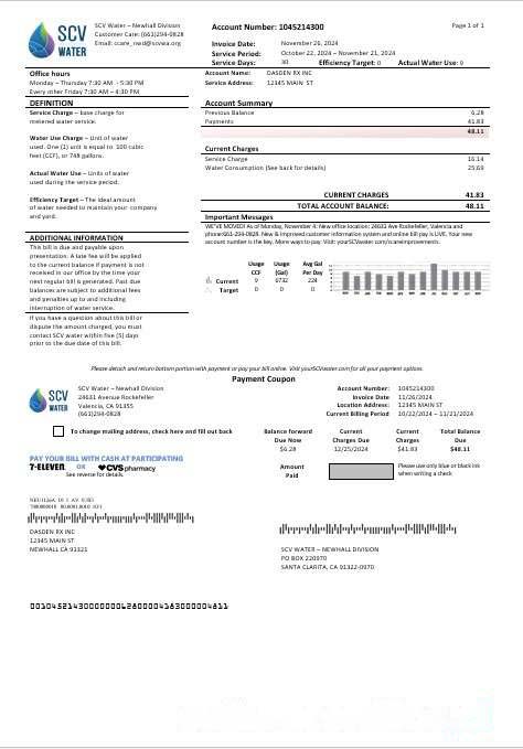 USA California Santa Clarita SCV Water business utility bill template in Word and PDF formats download template file