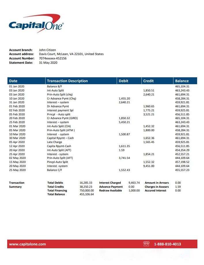 USA Capital One bank statement template, Word and PDF format (.doc and .pdf) download template file