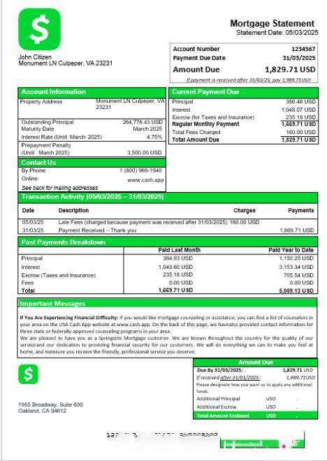 USA Cash App mortgage statement in Word and PDF formats download template file