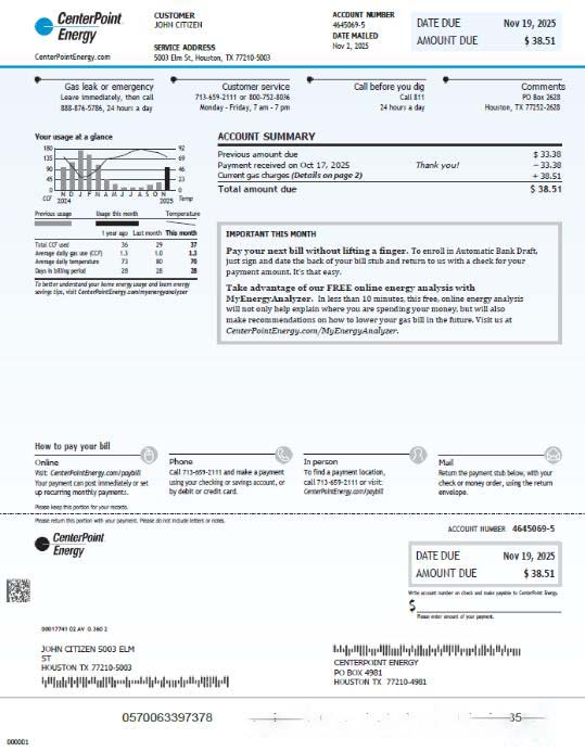 USA Center Point Energy utility bill template in Word and PDF formats download template file