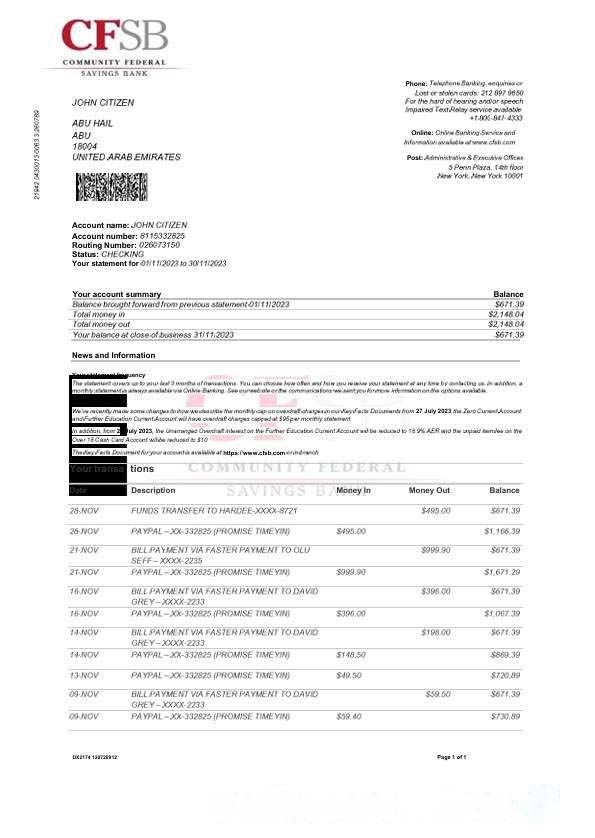 USA CFSB bank statement Word and PDF template download template file