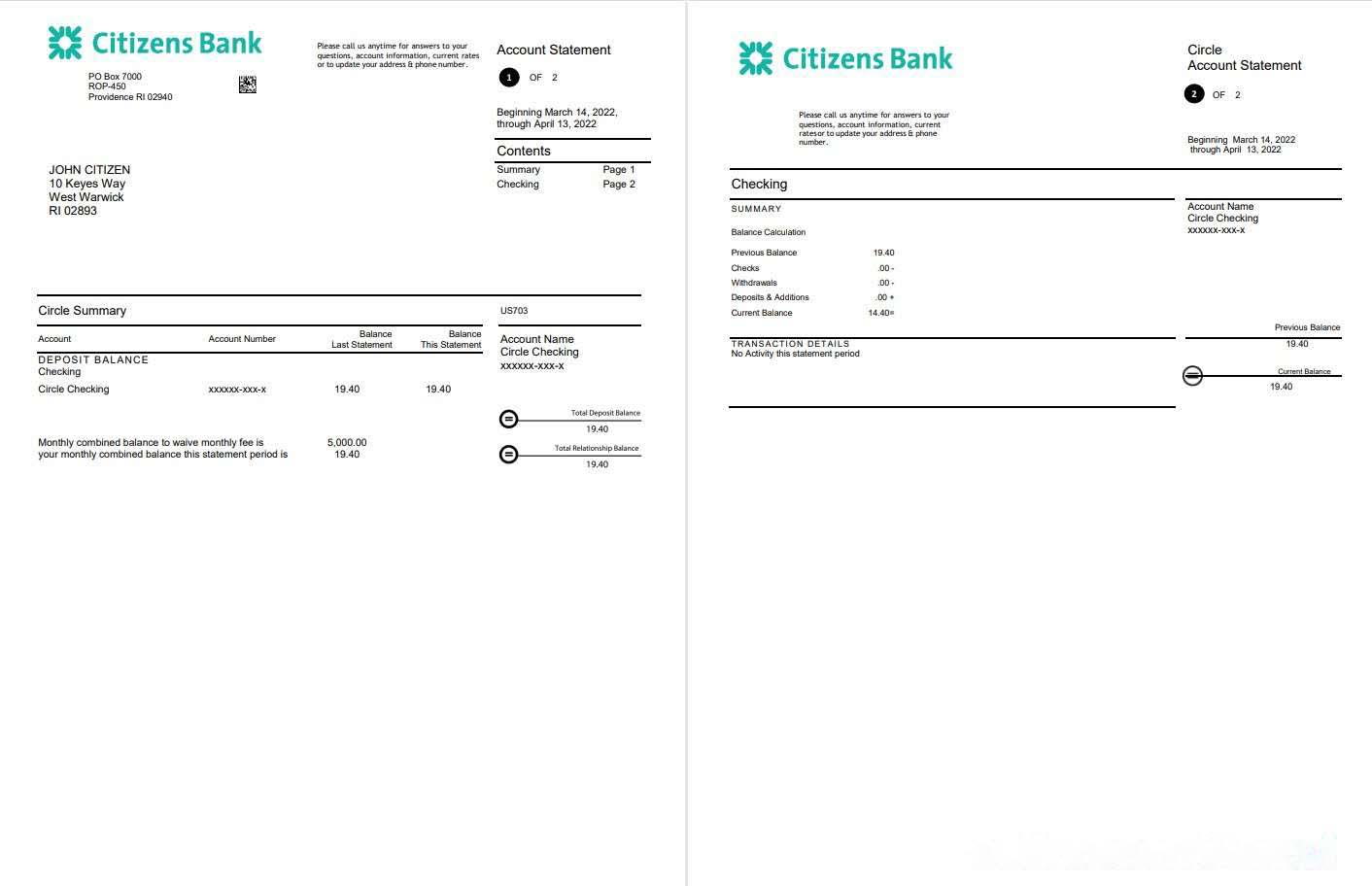 USA Citizens bank statement Word and PDF template, 2 pages download template file