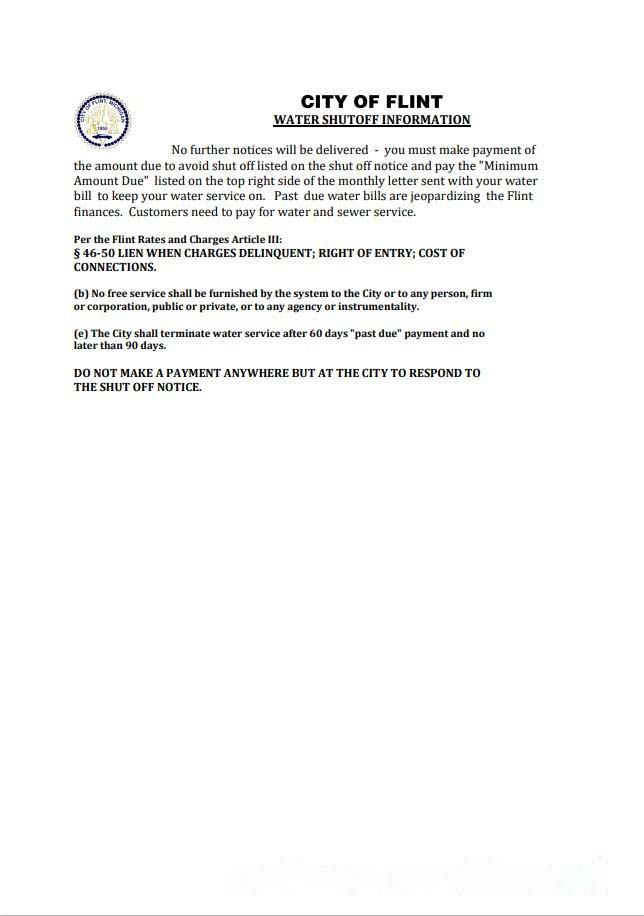 USA City of Flint Michigan water utility bill shutoff notice, Word and PDF template, version 2 download template file