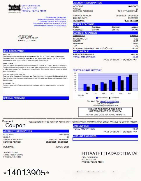USA City of Frisco utility bill template in Word and PDF formats download template file