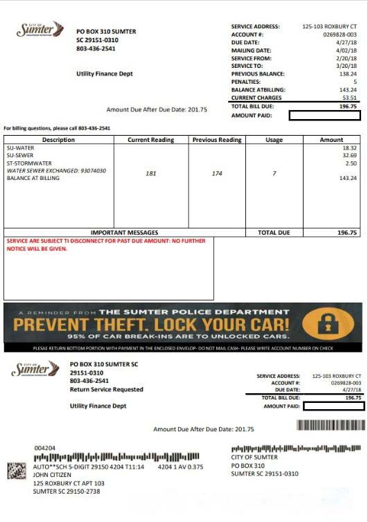 USA City of Sumter South Carolina water utility bill template in Word and PDF format download template file