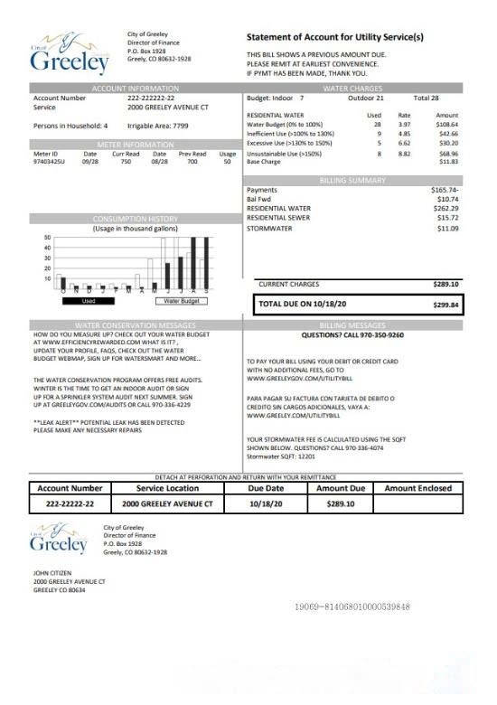 USA Colorado City of Greeley water utility bill template in Word and PDF format download template file