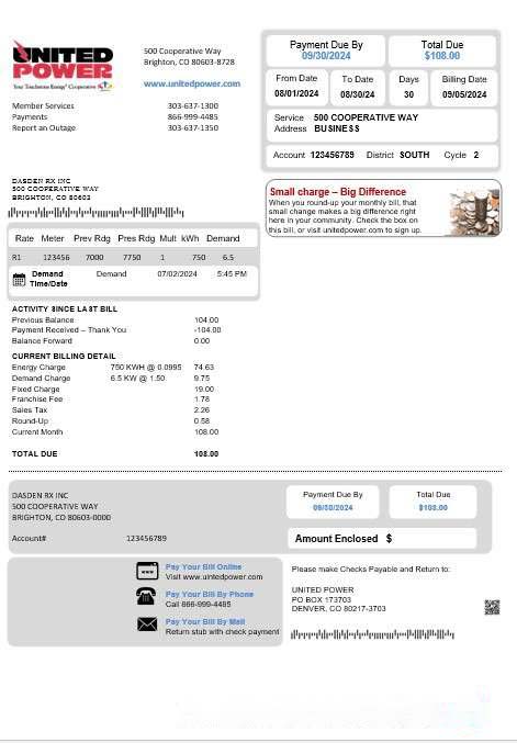 USA Colorado United Power business utility bill template in Word and PDF formats download template file